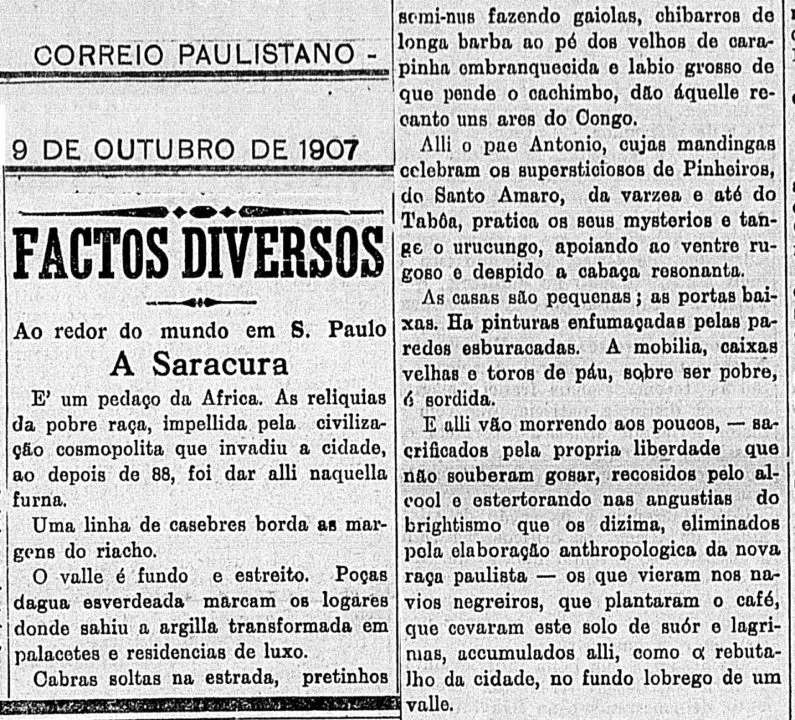 A região da Saracura era conhecida no início do século 20, como a “Pequena África”, com habitações dispostas em linha nas margens do riacho, animais soltos, crianças brincando nas ruas e idosos com seus cachimbos. Também ali teria sido um dos berços paulistanos do samba de bumbo e do batuque, tendo a Vai-Vai nascido nessa trajetória que vai do samba de roda aos cordões carnavalescos. A cartografia oficial da cidade, no entanto, por muito tempo invisibilizou lugares informais e de resistência, representando a área, no final do século 19, como desprovida de ocupação humana e dando destaque apenas para a vegetação local, a exemplo da mata do Caanguçu (usada abundantemente pelos moradores do quilombo) e o Tanque do Reúno, represa que abastecia as fontes do Largo do Piques e da Luz até meados de 1876.